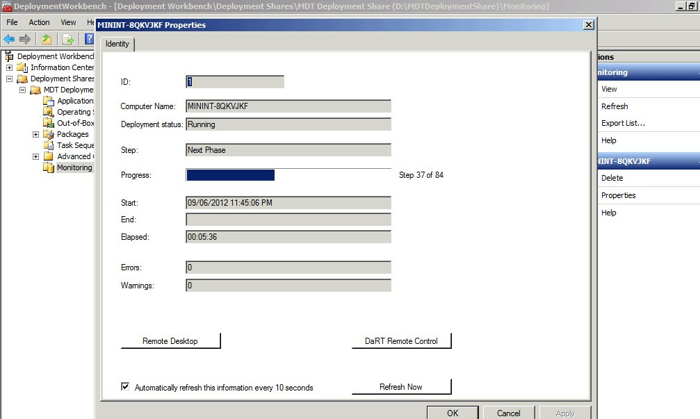 The second very useful capability that DaRT integration becomes available as soon as the MDT Welcome Wizard completes. Minimized at the bottom left corner of the Windows PE screen is the DaRT Remote Control app.