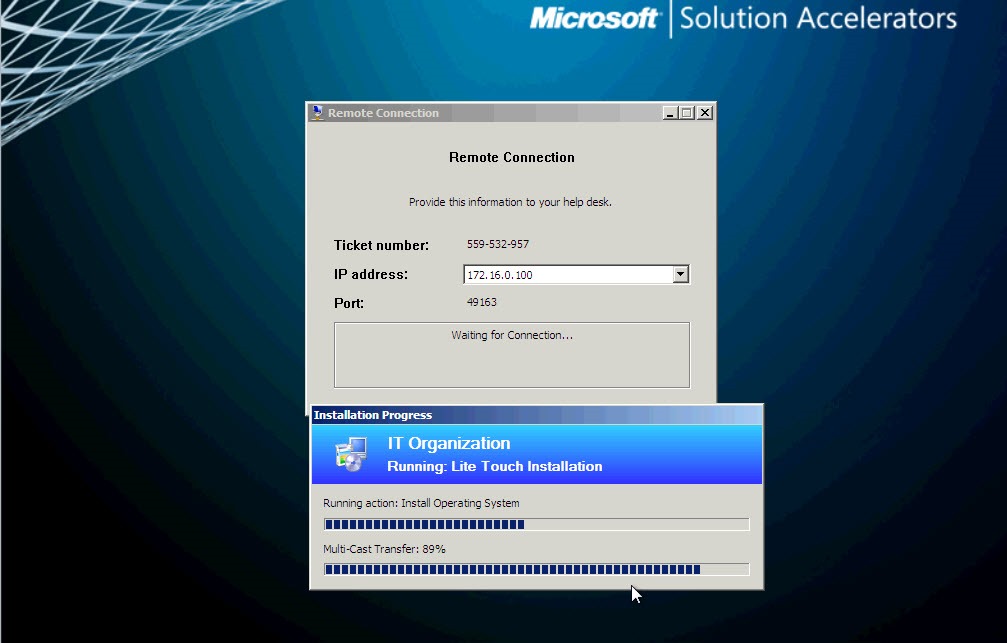 If you restore the Remote Control app, Remote Control Viewer window appears, The window provides you with your IP address, information about any current remote viewing sessions, and a ticket number which can be used to connect to the session (although if you have enabled monitoring in MDT 2012 the process is automated from the Deployment Workbench).
