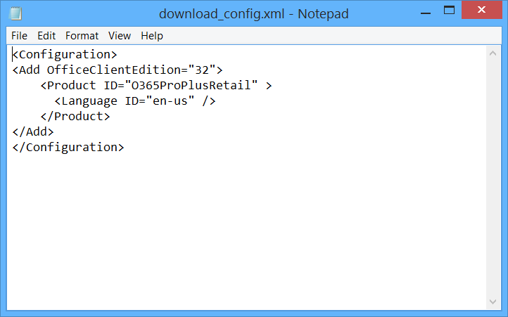 You will need to edit the configuration.xml file (don’t worry, it’s not hard). With setup.exe you can perform 3 basic tasks – download the source files, deploy or remove Office 365, or create an App-V package containing Office 365.