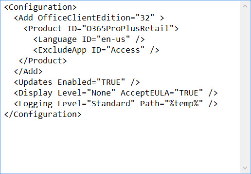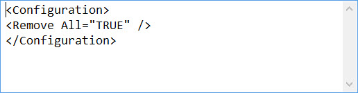 I have also created a configuration file to remove Office 365, which will be used in Configuration Manager should I later decide to remove the product. That configuration file is simple.