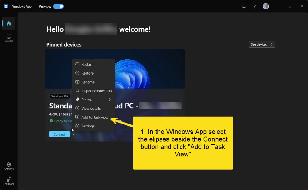 In the Windows App (which you can download from https://windows365.microsoft.com/) you will see all of the Windows 365 Cloud PCs associated with your account. Select the ellipses beside the “Connect” button on the one you would like to switch between and select “Add to Task view.”