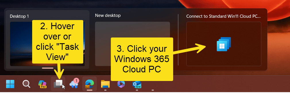 Now on your Windows 11 desktop you will need to locate the Task View icon from your taskbar. Hover over or click on the Task View icon and you will see the desktop you are currently logged into (Desktop 1 in my case). You will also see the option to connect to your Cloud PC.