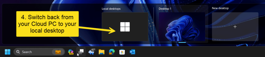 Switching back to your local desktop from your Cloud PC is equally simple. In your cloud PC just hover over the Task View icon and select “Local desktops”. Seconds later you will be back on your local desktop.